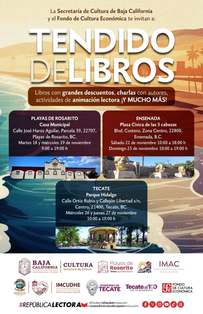 CDMX.- Entre el 18 y el 27 de noviembre, el Fondo de Cultura Económica (FCE) y el Gobierno de Baja California, a través de la Secretaría de Cultura del estado y en coordinación con los Ayuntamientos de Ensenada, Tecate y Playas de Rosarito, realizarán tres tendidos de libros con el propósito de fortalecer el hábito de la lectura entre la población de la entidad.