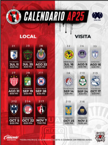 TIJUANA.- Xolos de Tijuana dio a conocer este miércoles su calendario para el torneo Apertura 2025 de la Liga MX, mismo que arrancará el 11 de julio en el Estadio Caliente ni más ni menos que ante su “hermano” Gallos Blancos del Querétaro.