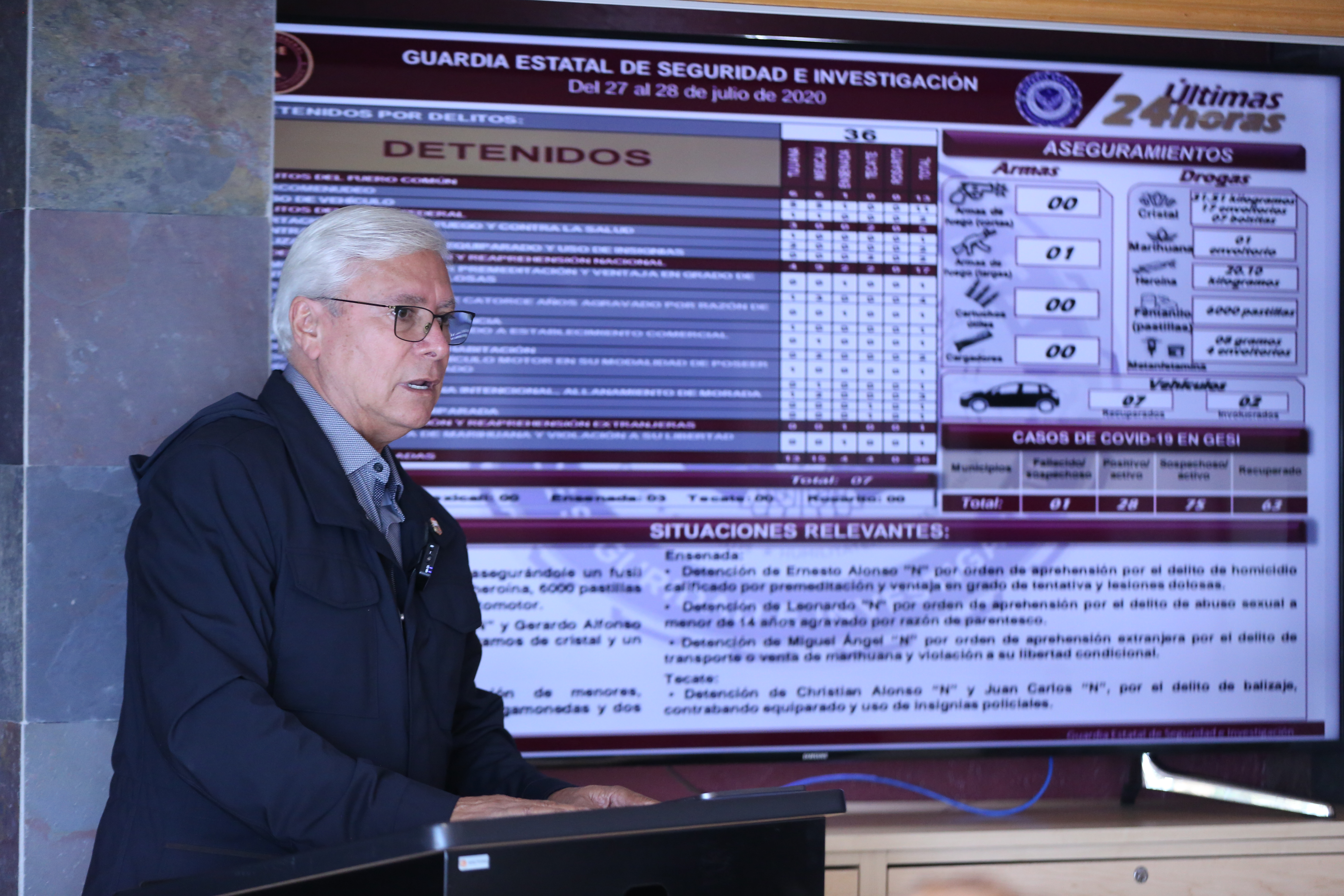 Durante el reporte que se ofrece diariamente, dijo que en esta ocasión la Guardia Estatal de Seguridad e Investigación (GESI), informó sobre el aseguramiento de 31.5 kilogramos y un envoltorio de cristal; un envoltorio de marihuana; 20.1 kilogramos de heroína; 6 mil pastillas de fentanilo, así como 8 gramos y 4 envoltorios de metanfetamina; la FGE reportó 7 homicidios.