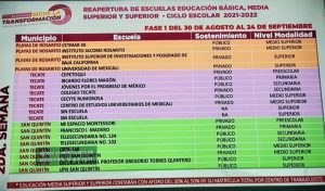 TIJUANA.- La Secretaría de Educación de Baja California dio a conocer las 48 escuelas públicas y privadas de todos los niveles educativos en los 6 municipios que regresarán a clases PRESENCIALES durante la primera y segunda semana del ciclo escolar que inicia el lunes 30 de agosto.