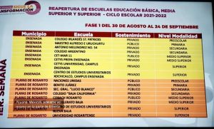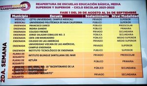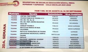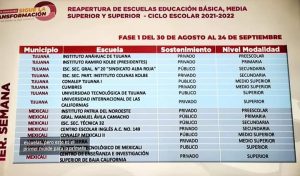 TIJUANA.- La Secretaría de Educación de Baja California dio a conocer las 48 escuelas públicas y privadas de todos los niveles educativos en los 6 municipios que regresarán a clases PRESENCIALES durante la primera y segunda semana del ciclo escolar que inicia el lunes 30 de agosto.