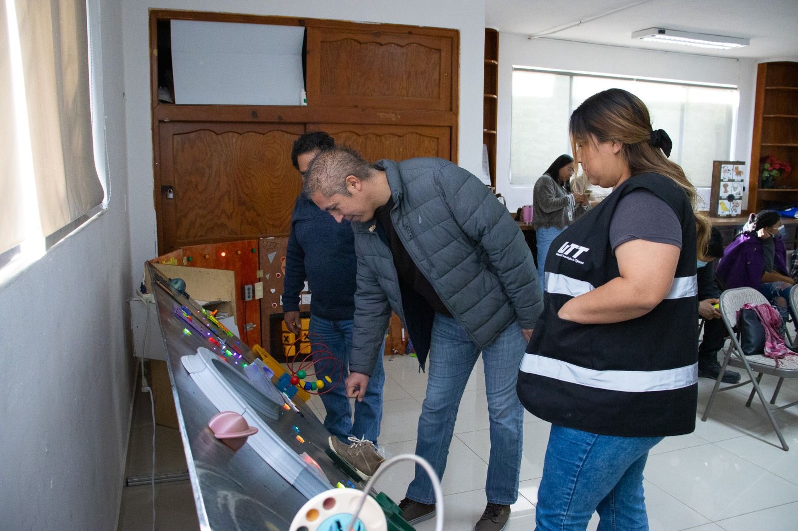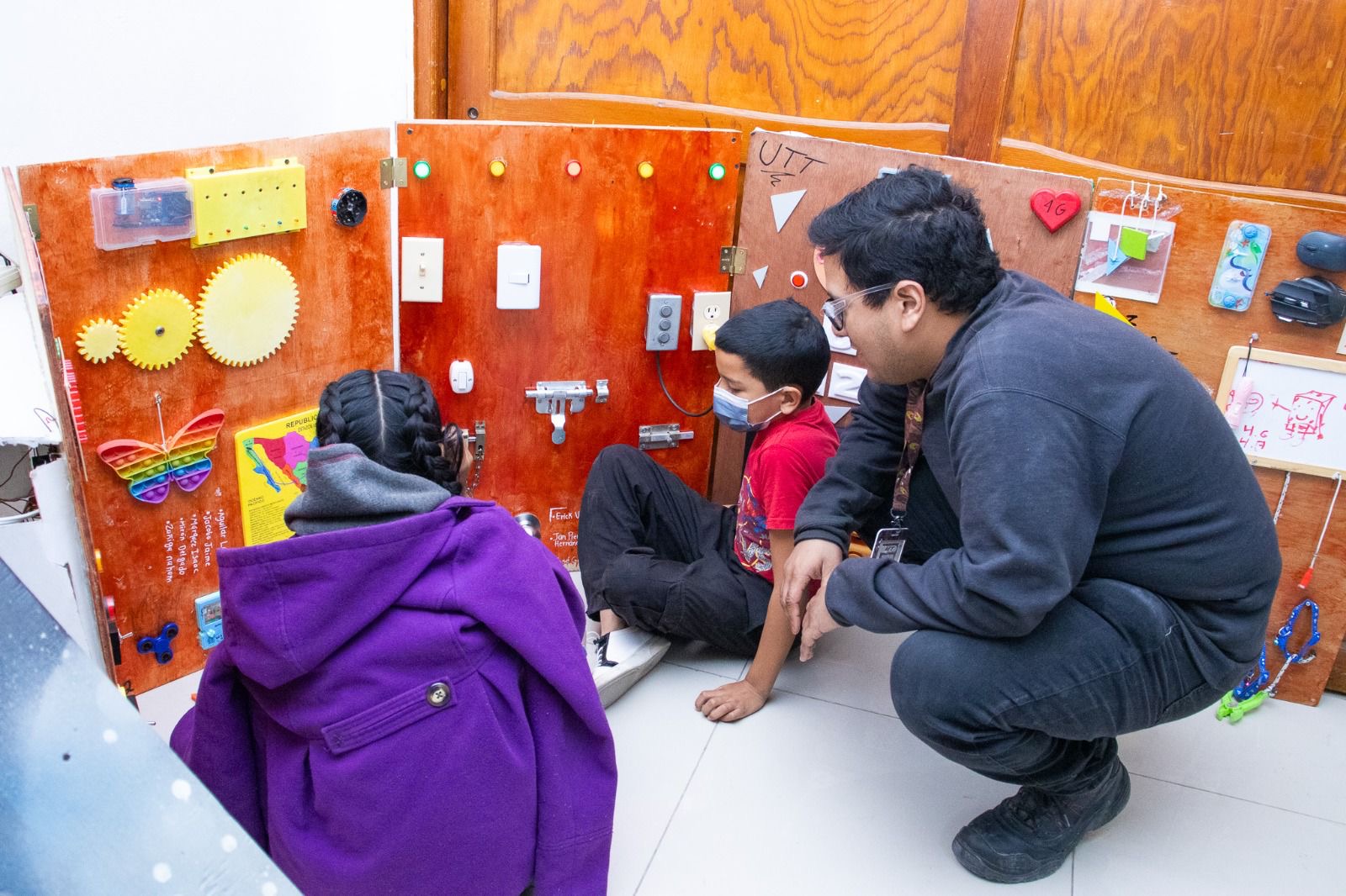 Las y los estudiantes comenzaron desde cero el proyecto, pero poco a poco fueron incorporando todos los elementos para que cada tablero contara con luces, colores, sonidos y otros elementos recomendados por psicólogos y fisioterapeutas de DIF Municipal, quienes previamente acudieron a las instalaciones de UTT para hablar sobre los requerimientos de los menores del espectro autista.