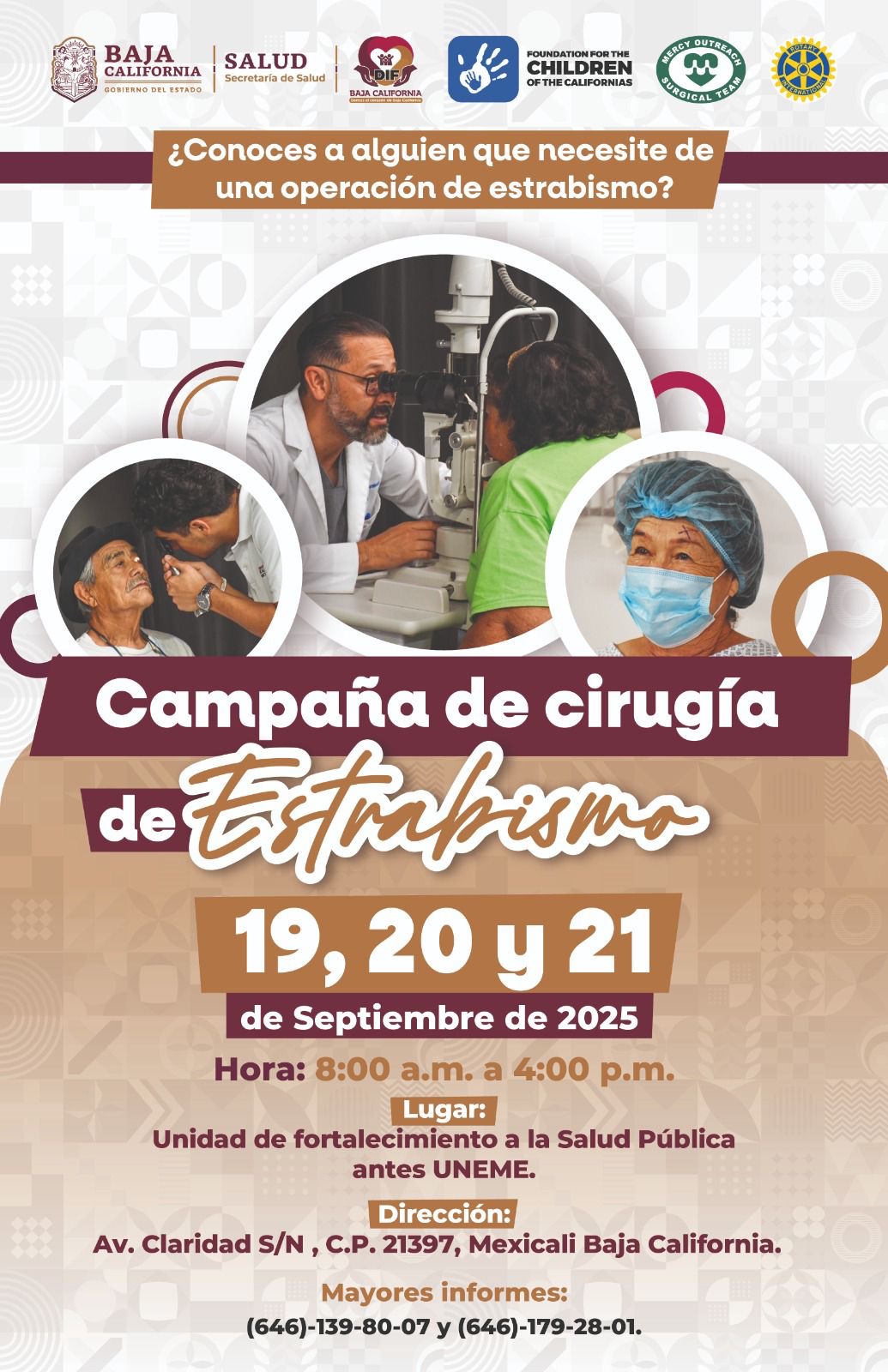 Mexicali.- Para la gobernadora Marina del Pilar Avila Olmeda cuidar la salud de las familias bajacalifornianas es una de los principales objetivos en los que se trabaja de manera ardua y responsable, en especial de las niñas y niños, garantizando que aquellos grupos prioritarios tengan acceso a los programas que les permitan tener una mejor calidad de vida, por lo que del 19 al 21 de septiembre se realizará la ya tradicional campaña de Cirugía de Estrabismo en Mexicali.