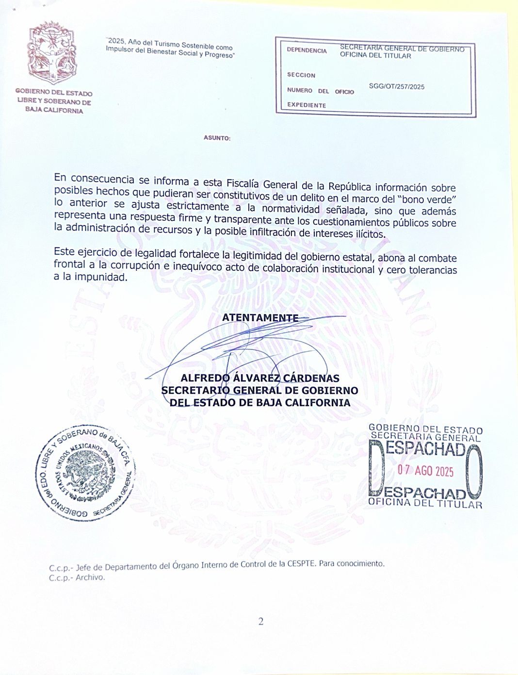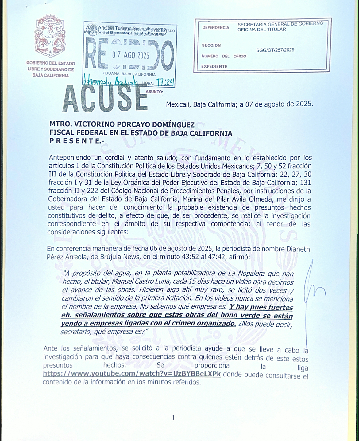 En el oficio SGG/OT/257/2025, el secretario de Gobierno, Alfredo Álvarez Cárdenas, anexo la liga de la conferencia Mañanera del 6 de agosto donde se hacen dichas acusaciones.