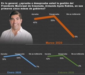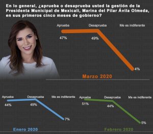 Los alcaldes de Tijuana, Arturo González Cruz, de Mexicali, Marina del Pilar Ávila Olmeda y de Ensenada, Armando Ayala Robles, bajaron 3, 4 y 2 puntos respectivamente, siendo la presidenta municipal de la capital del Estado, la mejor aprobada por segundo mes consecutivo.