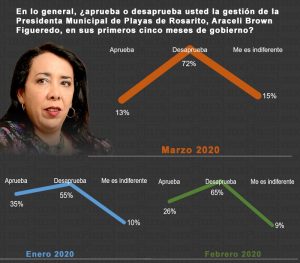 De acuerdo a los resultados de 3era Evaluación de Percepción Ciudadana de PluralMx, las alcaldesas Zulema Adams y Araceli Brown de Tecate y Playas de Rosarito respectivamente, cayeron 18 y 13 puntos porcentuales, respecto al estudio de campo realizado en el mes de febrero.