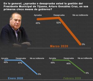VITRINA METODOLÓGICA: El período de levantamiento se realizó entre el 16 y 20 de Marzo de 2020. Universo de Estudio: Lo conformaron residentes mayores de edad de los municipios de Tijuana, Playas de Rosarito, Mexicali, Ensenada y Tecate, Baja California, con credencial de elector para confirmar domicilio y edad. Objetivo del estudio: Evaluar la gestión de los presidentes municipales a cuatro meses de su gobierno. Tamaño de Muestra: El tamaño de la muestra fue de 600 entrevistas efectivas cara a cara en cada uno de los municipios, descartando como primer filtro a quienes no mostraron su credencial. Representatividad: El cálculo de la muestra permite un margen de error de 4.5 por ciento +/- y un nivel de confianza en el rango del 95. Técnica de muestreo: aleatorio simple, partiendo de una selección en viviendas, donde los encuestadores abordaron a la primera persona que quiso responder, dando un salto de cinco en cinco para aplicar la segunda entrevista. Responsable del estudio: Lauro Ortiz Aguilera. Encuestadores: alumnos de la carrera de comunicación de la Universidad Autónoma de Baja California (UABC), campus Tijuana y Mexicali. Encuesta auspiciada por PluralMx. Programa estadístico de recolección de datos: SPSS 23.0.
