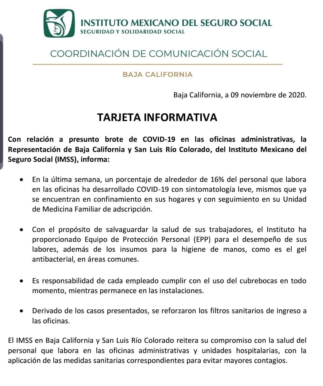 BAJA CALIFORNIA.- A respuesta de la nota informativa publicada en este espacio sobre el brote de COVID19 en las oficinas de la Delegación del Instituto Mexicano del Seguro Social, la representación del #IMSS en Baja California y San Luis Río Colorado reconoció el contagio masivo en los trabajadores de diferentes áreas administrativas.