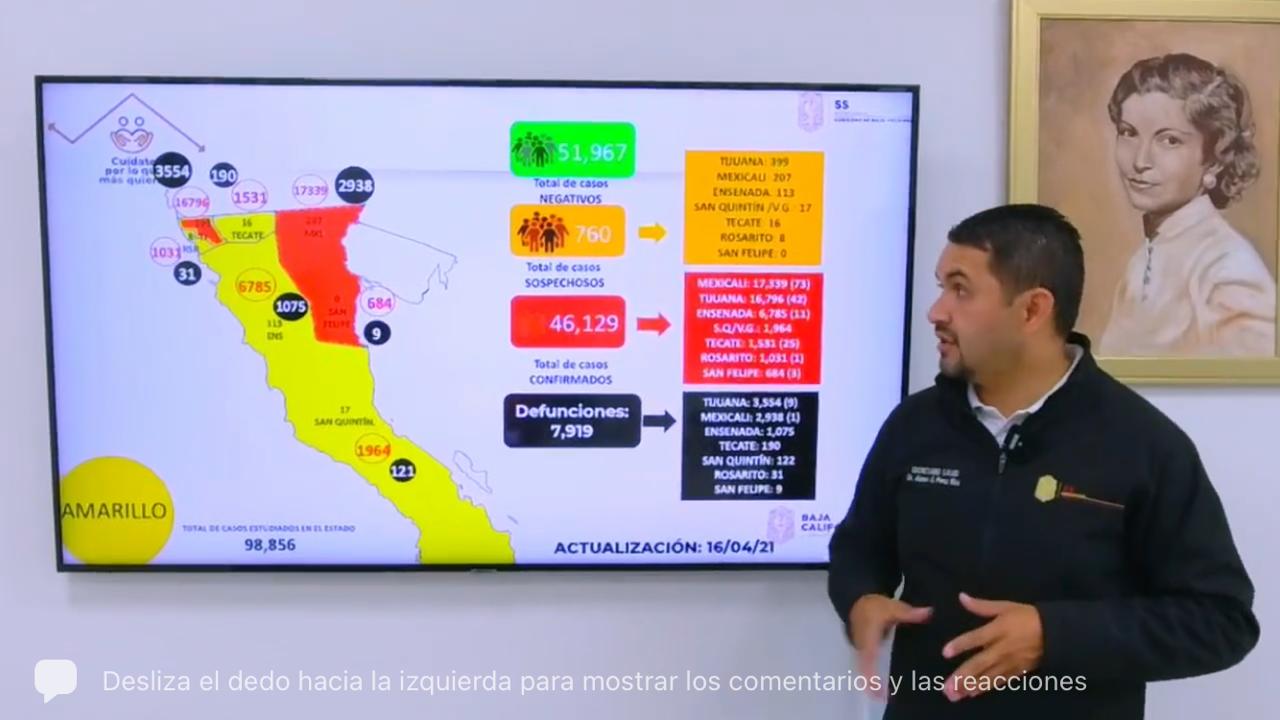 El secretario de Salud del Estado, Alonso Pérez Rico informó que en las últimas semanas continúa un aumento en los contagios, y de los 154 del día de ayer 73 fueron en Mexicali, 42 en Tijuana, 25 en Tecate, 11 en Ensenada, 3 en San Felipe y 1 en Rosarito.