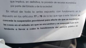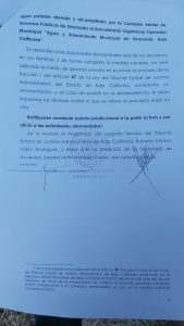 El documento señala lo siguiente “Con fundamento en lo expuesto en los artículos 77 y 78 de la ley que rige a este tribunal se concede la suspensión provisional para efectos de que se mantengan las cosas en el estado en que se encuentran y se suspende todo acto tendente a llevar a cabo la transferencia de los servicios públicos de agua potable, drenaje y alcantarillado por la comisión estatal de servicios públicos de Ensenada”.