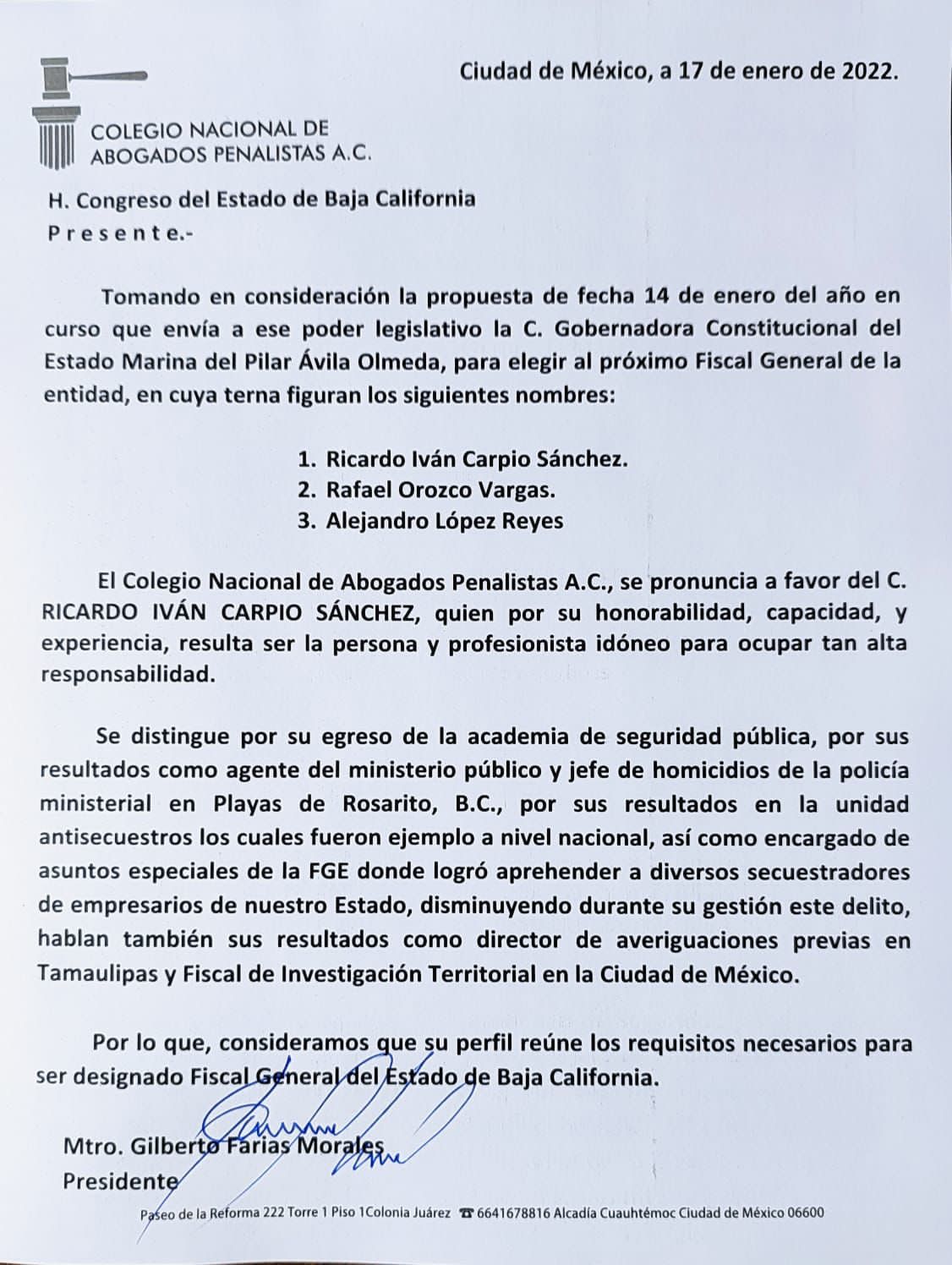 TIJUANA.- A través de un documento dirigido al Congreso del Estado de Baja California, Integrantes del Colegio Nacional de Abogados Penalistas A.C., se pronunciaron a favor de Ricardo Iván Carpio Sánchez, propuesto dentro de la terna para elegir al nuevo fiscal general del Estado.