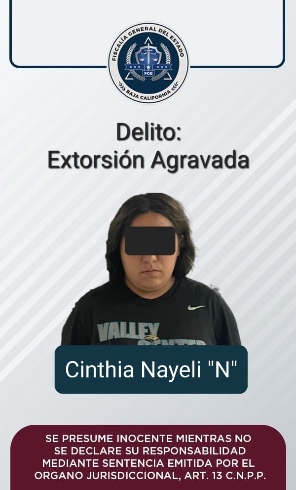 PLAYAS DE ROSARITO.- La Fiscalía Regional de Playas de Rosarito obtuvo auto de vinculación a proceso penal y medida cautelar de prisión preventiva contra Cinthia Nayeli “N”, por el del delito de extorsión agravada, por hechos denunciados en marzo del año en curso en perjuicio de un menor de edad.