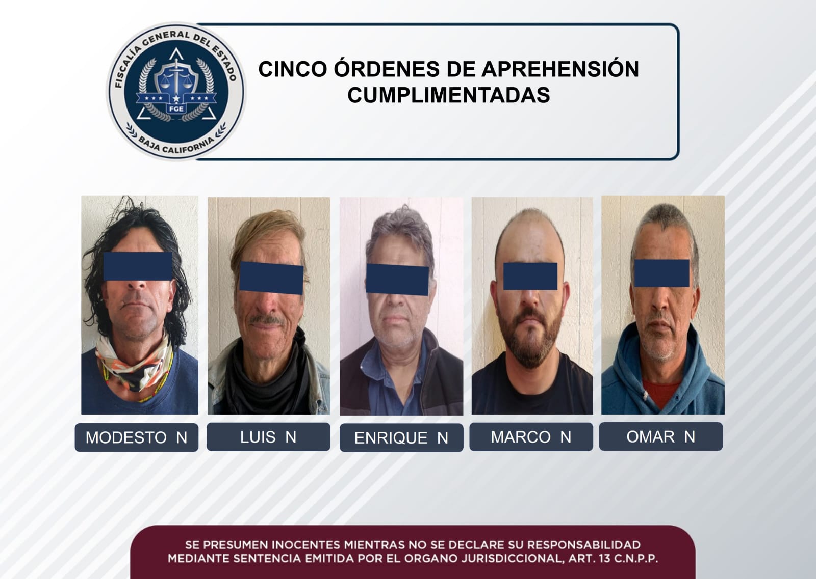 ENSENADA.- Tras completar líneas de investigación especializadas para la captura de sujetos que cuentan con mandatos judiciales activos en su contra, elementos de la corporación policial de la Fiscalía General de Estado (FGE) ubicaron y arrestaron en distintos puntos del puerto, a cinco individuos que eran requeridos por la ley.