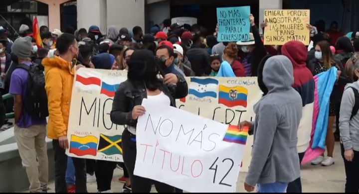 “No más Título 42”, “¡Defender el asilo!”, “También tenemos familia LGBTI”, se leían en sus mantas y pancartas.