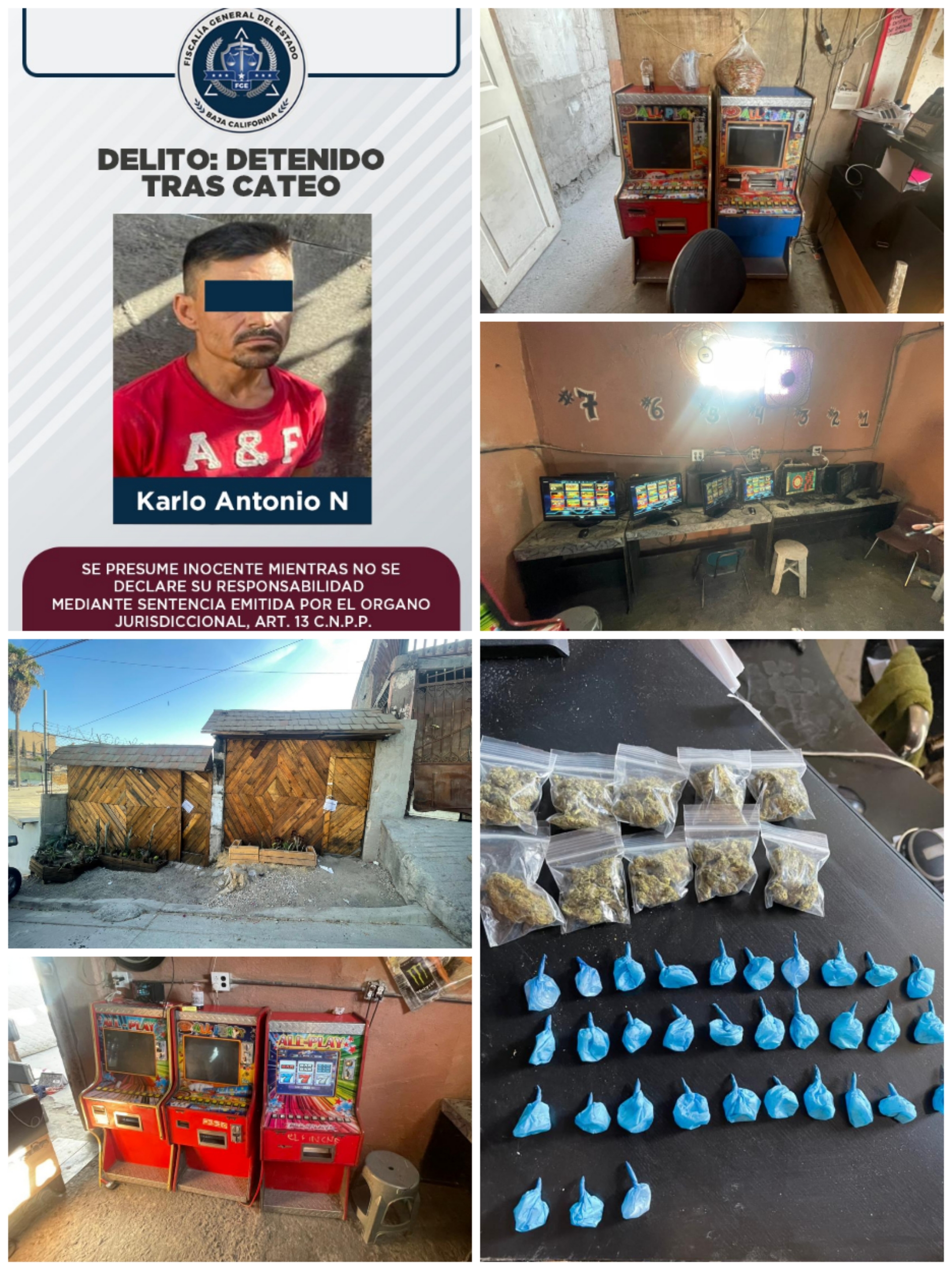 TIJUANA.- La Fiscalía General del Estado (FGE), continúa en el combate frontal a la venta de droga en la entidad, por lo que en esta ocasión se realizó un cateo en la colonia El Florido logrando la detención de un hombre, el decomiso de envoltorios de droga y máquinas tragamonedas.