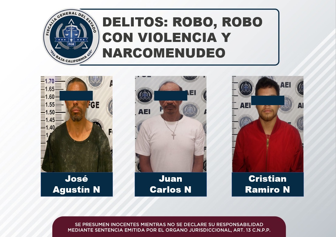 TIJUANA.- Como resultado de las indagatorias y las labores de inteligencia que realizan elementos de la Agencia Estatal de Investigación (AEI) de la Fiscalía Regional de Tijuana, se logró, en hechos distintos, la cumplimentación de tres órdenes de aprehensión por los delitos de robo, robo con violencia y narcomenudeo.