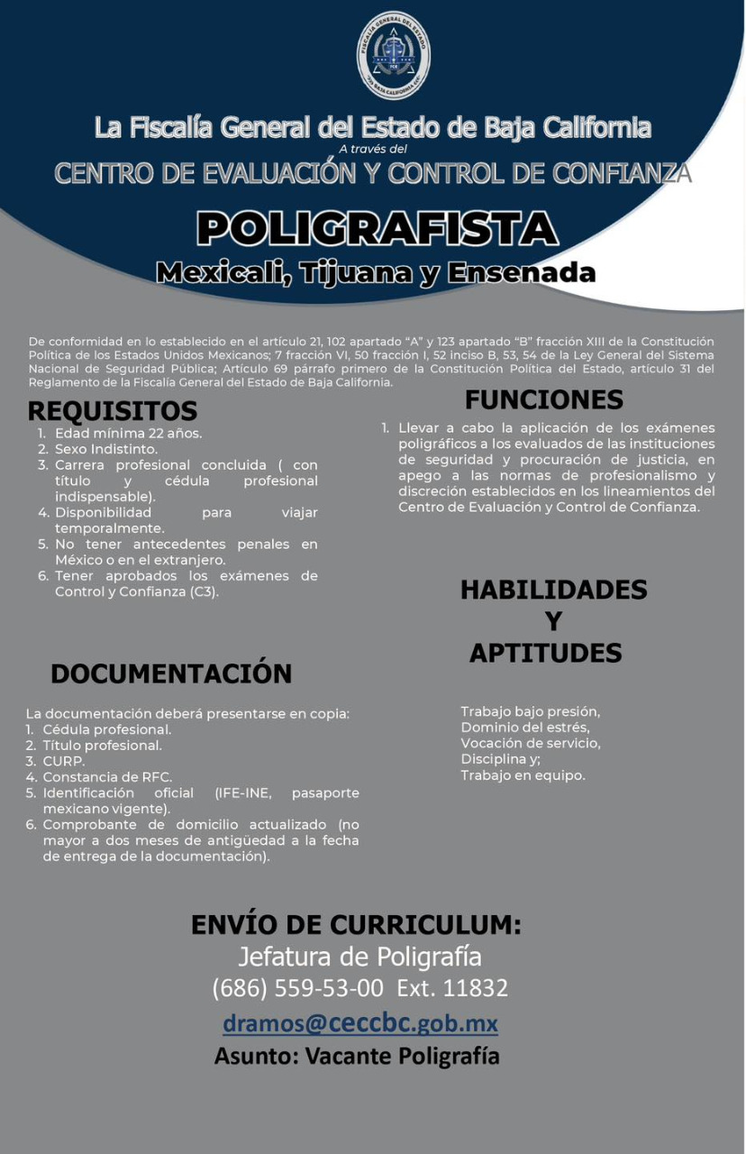 TIJUANA.- Con el objetivo de fortalecer el personal de las diferentes áreas de la Fiscalía General del Estado, esta institución mantiene abierta la convocatoria con vacantes para laborar en el Centro de Evaluación y Control de Confianza (C3).
