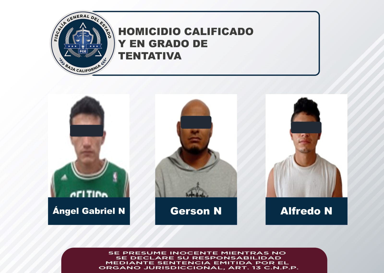 ENSENADA.- La Fiscalía General del Estado (FGE), mediante labor de la Fiscalía Especializada en Delitos Contra la Vida, logró que, en distintas audiencias, el Juez de Control vinculara a proceso penal y fijara prisión preventiva a tres sujetos, al parecer, involucrados en ataques armados y el asesinato de dos personas, en hechos cometidos por separado.