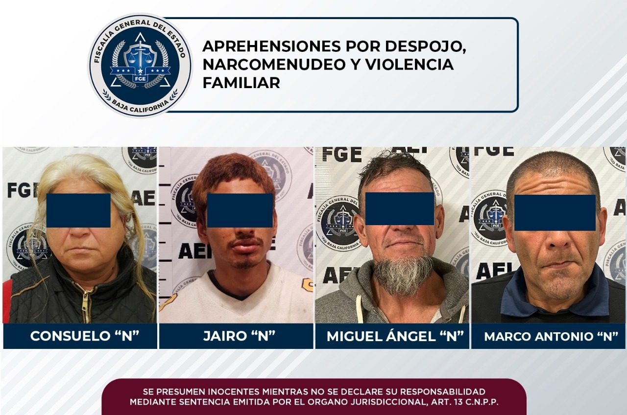 TIJUANA.– En asuntos diversos fueron capturados por elementos de la Agencia Estatal de Investigación (AEI), tres hombres y una mujer, quienes contaban con órdenes de aprehensión en su contra por los delitos de despojo, contra la salud en la modalidad de narcomenudeo, y violencia familiar.