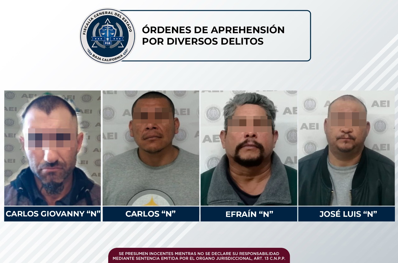 TECATE.- Por tener cuentas pendientes con la justicia por los delitos de robo de vehículo, incumplimiento de las obligaciones de asistencia familiar, violencia familiar y lesiones, cuatro sujetos fueron aprehendidos por la Agencia Estatal de Investigación (AEI).