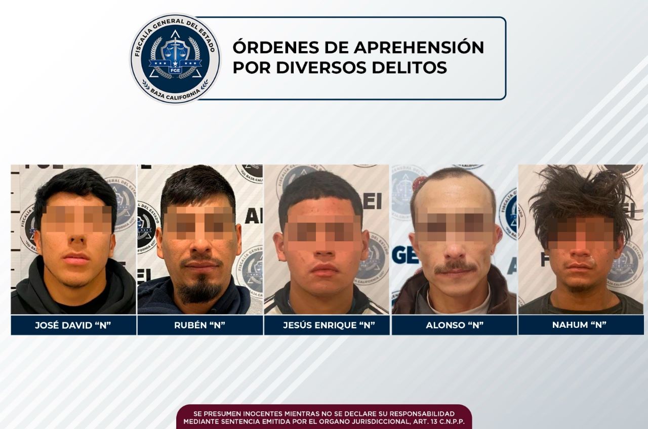 TIJUANA.- Por contar con un mandamiento judicial activo emitido por un Juez de Control, cinco hombres fueron aprehendidos en diferentes diligencias efectuadas por elementos de la Agencia Estatal de Investigación (AEI), de la Fiscalía General del Estado (FGE).