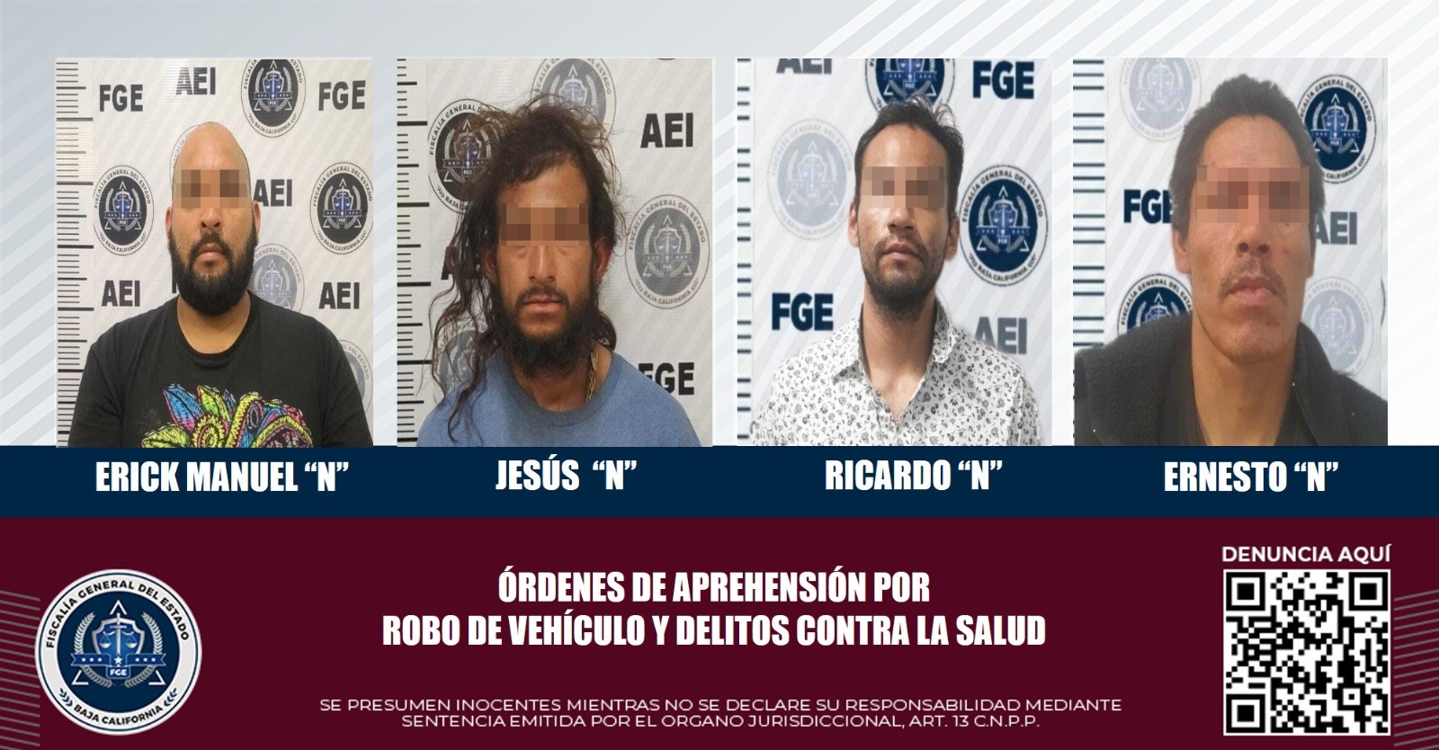 TIJUANA.- El Grupo Especializado de Aprehensiones de la Fiscalía General del Estado, cumplimentó mandamientos judiciales en contra de cuatro hombres, tres de ellos acusados por delitos contra la salud y otro por su presunta comisión en robo de vehículo.