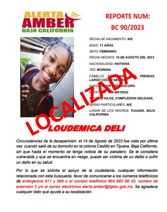 TIJUANA.- La Fiscalía General del Estado (FGE) informa que ha localizado a Loudemica Deli, menor haitiana de 11 años, por quien se había emitido una Alerta Amber.
