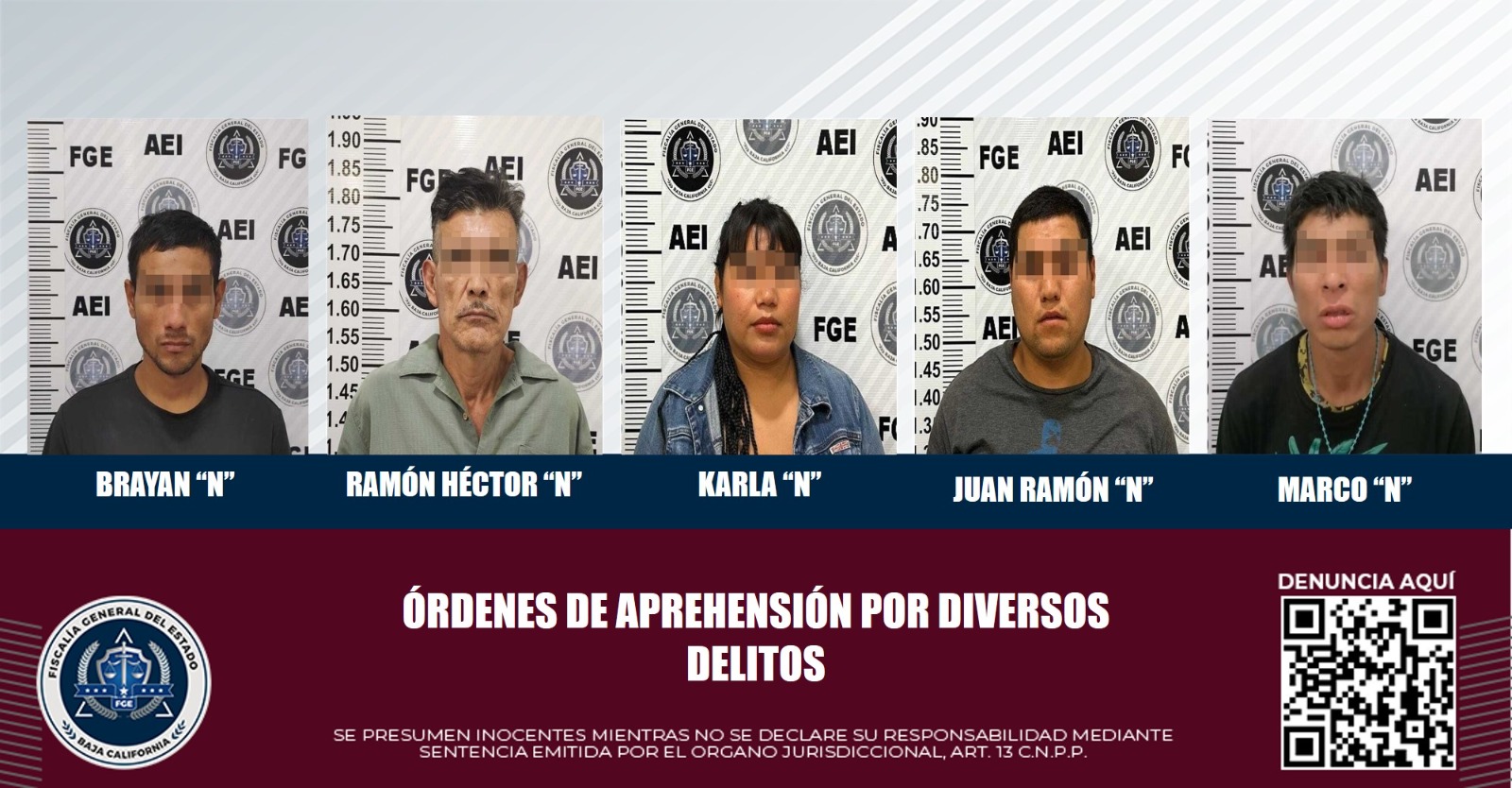 TIJUANA.- Con el objetivo de capturar a quienes se encuentran prófugos de la justicia y que son investigados por algún tipo de delito, la Fiscalía General del Estado obtuvo y cumplimentó, recientemente, mandamientos judiciales por homicidio, robo, resistencia de particulares y narcomenudeo.