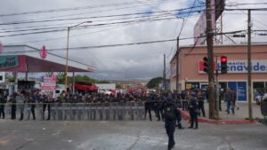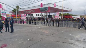 En el crucero del bulevar Diaz Ordaz, una calle antes de las 5 y 10, oficiales preventivos llegaron para retirar las unidades del transporte que fueron colocadas después de las seis de la mañana.