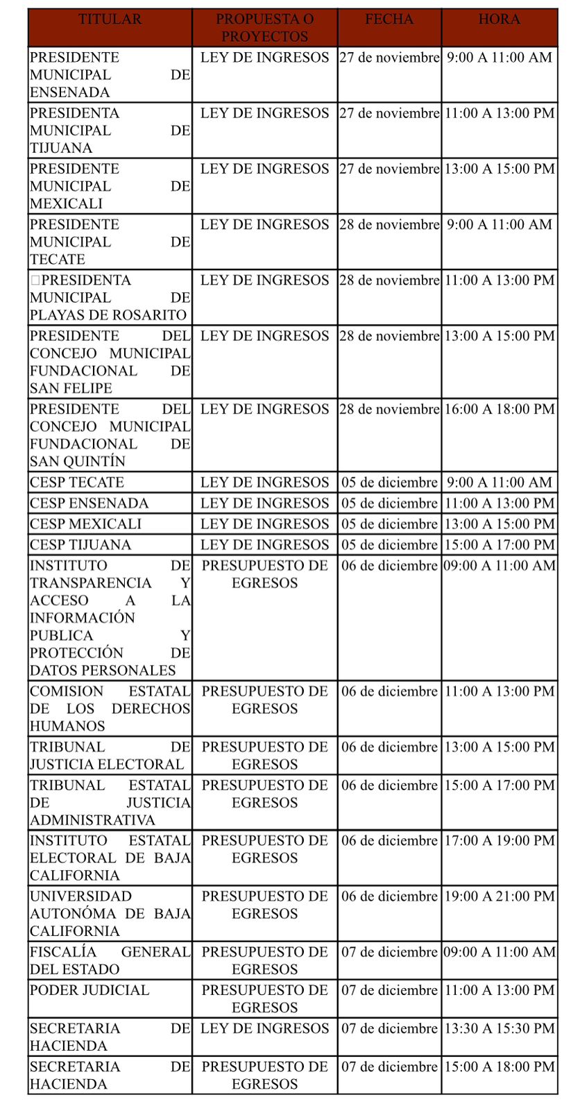 MEXICALI.- Fue aprobado por el Pleno, el punto de acuerdo relativo al calendario de las comparecencias de las y los titulares de los ayuntamientos, concejos fundacionales municipales, organismos autónomos, así como el Poder Ejecutivo estatal, con el fin de obtener una explicación detallada de los proyectos de Presupuestos de Egresos e iniciativas de Leyes de Ingresos para el ejercicio fiscal 2024.