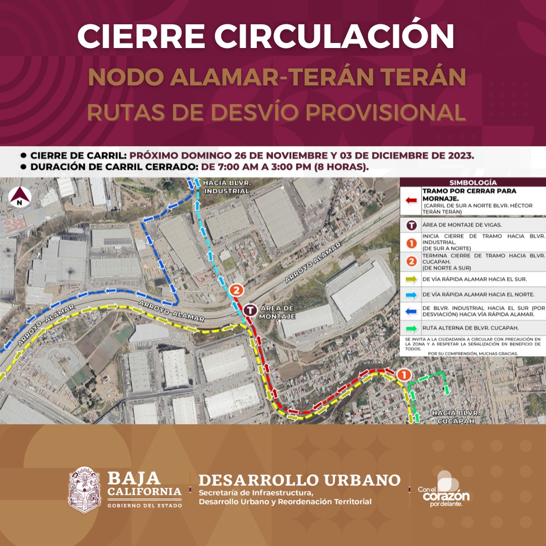 TIJUANA.- La Secretaría de Infraestructura, Desarrollo Urbano y Reordenación Territorial (SIDURT) informa que los domingos 26 de noviembre y 3 de diciembre, habilitará rutas de desvío por el cierre de carril para montaje de 4 vigas en el nodo vial y puente Alamar – Terán Terán de Tijuana.