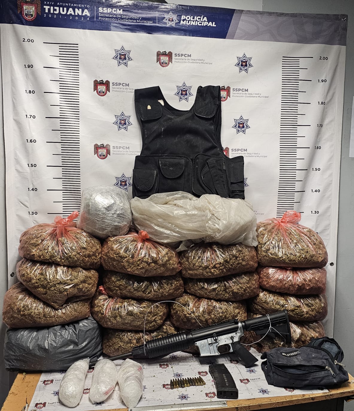 Dicha bolsa contenía en su interior un arma larga abastecida con 13 cartuchos útiles, así como un chaleco balístico, tres envoltorios de casi tres kilos de lo que parecía ser “cristal” y varias bolsas de plástico que contenían lo que parecía ser marihuana, dando un total de casi 40 kilos.