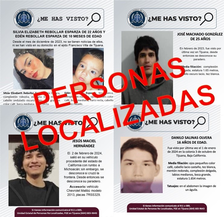 TIJUANA.- El personal de la Fiscalía General del Estado ha logrado ubicar a cinco personas que habían sido reportadas como desaparecidas. Entre ellas se encuentran una mujer y su hijo de 10 meses de edad, y tres hombres, quienes fueron encontrados con buen estado de salud.