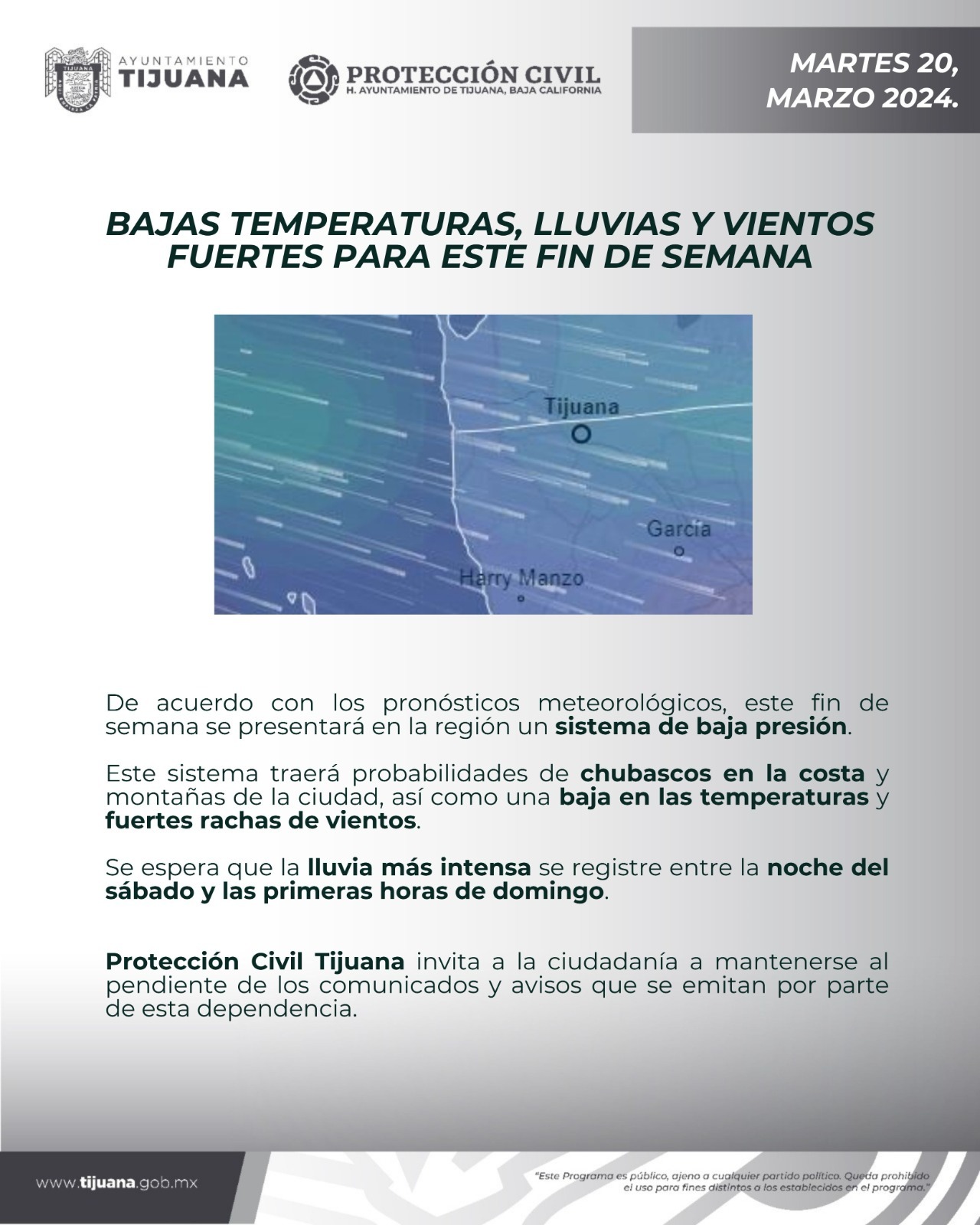 TIJUANA.- De acuerdo con los pronósticos meteorológicos, este fin de semana se presentará en la región un sistema de baja presión.