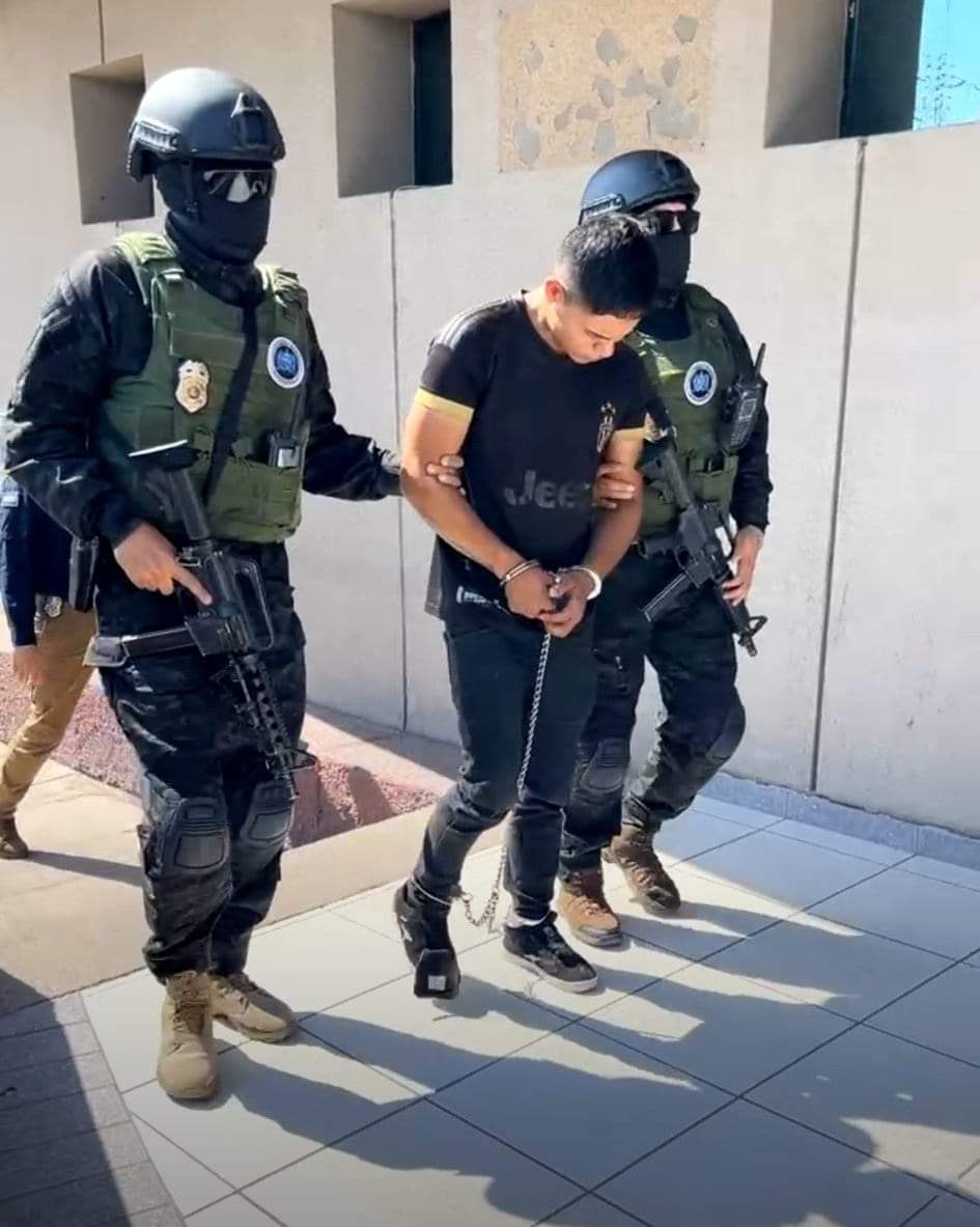 El joven, de 24 años, tenía las manos esposadas a los pies, también encadenados, por lo que caminaba lentamente al salir de la Comandancia de la Agencia Estatal de Investigación (AEI) de la Fiscalía General del Estado.