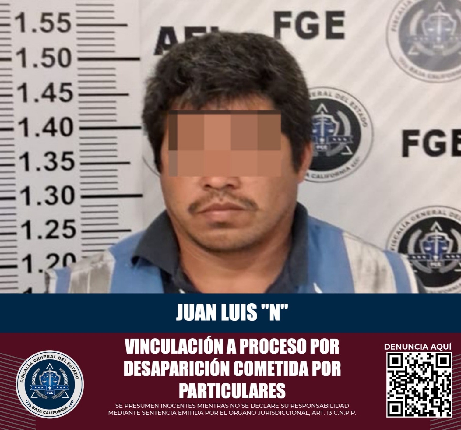TIJUANA.- La Fiscalía General del Estado obtuvo la vinculación a proceso de Juan Luis “N”, alias “El Chapito”, por el delito de desaparición cometida por particulares en perjuicio de una mujer. La Fiscalía presentó pruebas contundentes que incriminan al imputado en hechos ocurridos en febrero del presente año.