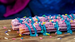 · Churro de celebración del 70.º aniversario, disponible en carritos de churros selectos: churro clásico cubierto con azúcar ube, glaseado de frambuesa azul jaspeada y chispas.