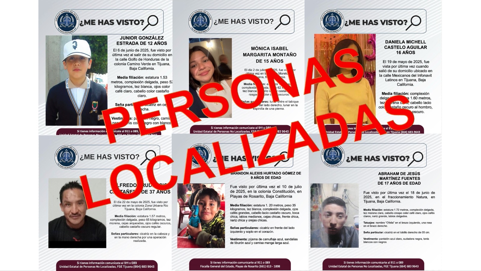 TIJUANA, BC.- La Fiscalía General del Estado (FGE) informa la localización de seis personas que habían sido reportadas como desaparecidas, cinco de ellas menores de edad. Este grupo localizado en diversas acciones, compuesto por dos mujeres y cuatro hombres, estaba en condiciones óptimas de salud.