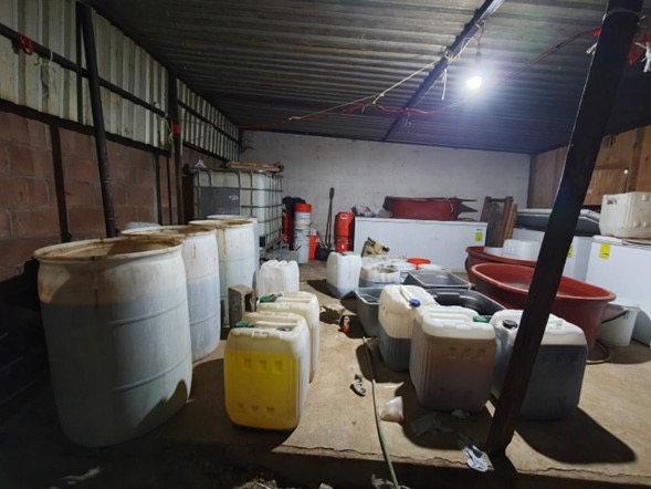En el laboratorio encontraron mil 758 litros de metanfetamina, 91 bolsas de la droga con un peso de 141 kilogramos, 197 gramos de clorhidrato de metanfetamina, 65 litros de acetona, 90 litros de hidrocarburos, 25 kilogramos de hidróxido de sodio y tres cartuchos de arma de fuego.