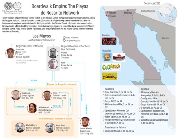 Tijuana, Baja California, septiembre 18 de 2025.- El Departamento del Tesoro de Estados Unidos anunció sanciones contra una facción del Cártel de Sinaloa con presencia en Baja California, a la que calificó como organización terrorista extranjera.