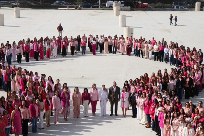 Tijuana.- Como parte de las acciones de sensibilización en la lucha contra el cáncer de mama, este martes, el presidente municipal de Tijuana, Ismael Burgueño Ruiz, junto a las mujeres que conforman el XXV Ayuntamiento de Tijuana, formaron un listón rosa para la toma de una fotografía simbólica, como muestra de unión, esperanza y compromiso en favor de la salud preventiva.