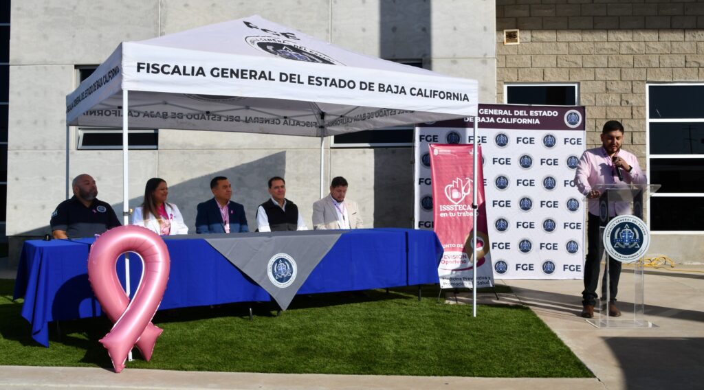 El evento contó con la participación del Fiscal Regional de Ensenada, Lic. Miguel Ángel Pérez Rojas; el Comandante de la Agencia Estatal de Investigación (AEI), René Arroyo Ruiz; el Coordinador Administrativo, Lic. David Piza Núñez; el Director de ISSSTECALI en Ensenada, Dr. José Antonio García Rivera; y la Dra. Elizabeth Ortiz Rodríguez, Jefa de Medicina Preventiva.
