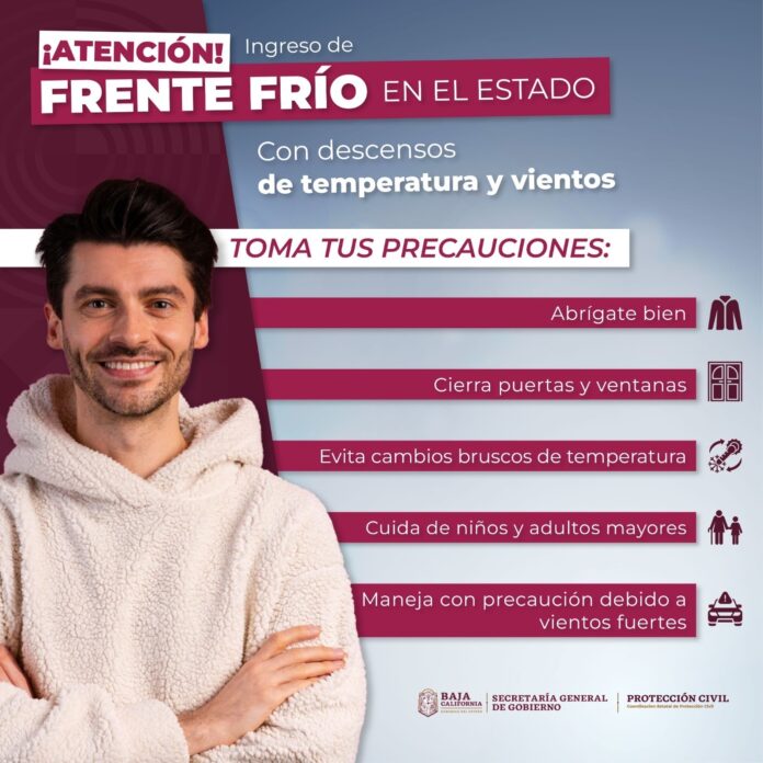 TIJUANA.- La Coordinación Estatal de Protección Civil (CEPC) informa que, de acuerdo con los pronósticos del Servicio Meteorológico Nacional (SMN) de la Comisión Nacional del Agua (Conagua), el frente frío número 15, ingresará a partir de la noche de este lunes.