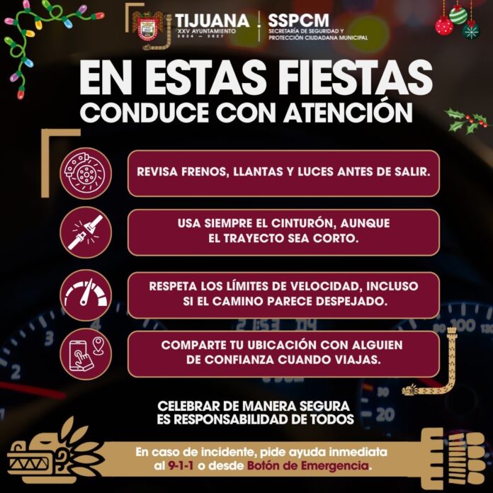 Tijuana.- Con motivo de la temporada decembrina, la Secretaría de Seguridad y Protección Ciudadana Municipal (SSPCM) hace un llamado a la ciudadanía a conducir con responsabilidad y a extremar precauciones para prevenir accidentes en carreteras y vialidades de la ciudad.