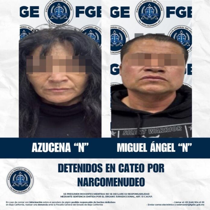 La diligencia se llevó a cabo en un domicilio ubicado sobre la calle Rosarito, en la colonia Crosthwhite, de la ciudad de Playas de Rosarito, Baja California, donde fueron localizados Miguel Ángel “N”, alias “El Miguelón”, y Azucena “N”, quienes fueron detenidos por su presunta responsabilidad en delitos contra la salud. Durante el cateo se aseguraron 10 envoltorios de plástico color azul sellados al calor, así como 2 envoltorios adicionales del mismo material, los cuales contenían una sustancia granulada al tacto con las características propias de la droga conocida como metanfetamina.
