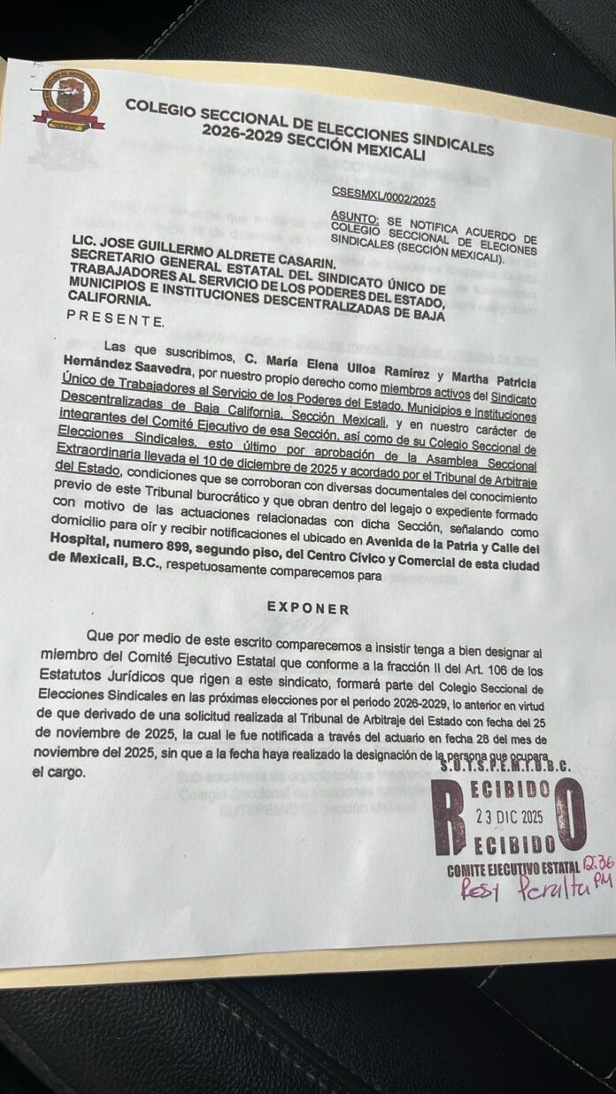 Mediante un oficio enviado el pasado 25 de diciembre, el tribunal solicitó al Comité Estatal de Burócratas designar únicamente a un representante para integrarse al consejo ya instalado en Mexicali, el cual cuenta con el respaldo unánime de todos los aspirantes a la secretaría general municipal.