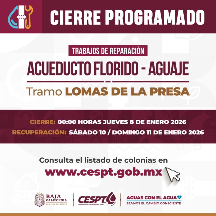 TIJUANA.- La Comisión Estatal de Servicios Públicos de Tijuana (CESPT) informa que el jueves 8 de enero, a partir de las 00:00 horas, se suspenderá el suministro de agua potable en 691 colonias de Tijuana y Playas de Rosarito, debido al inicio de trabajos de interconexión en el Acueducto Florido-Aguaje, en el tramo ubicado en la colonia Lomas de la Presa.
