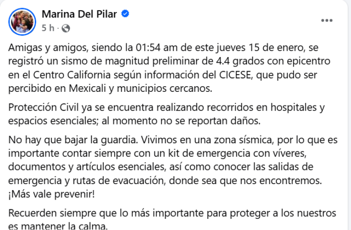 La gobernadora Marina del Pilar Ávila Olmeda informó que, tras el movimiento, Protección Civil del Estado realizó recorridos preventivos en hospitales y espacios considerados esenciales, descartándose afectaciones mayores.