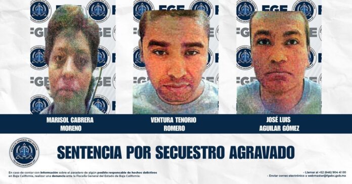 TIJUANA.- La Coordinación de Averiguaciones Previas y Control de Proceso, adscrita a la Fiscalía Regional de Tijuana, obtuvo sentencia condenatoria en contra de Marisol Cabrera Moreno, Ventura Tenorio Romero y José Luis Aguilar Gómez, por su responsabilidad en el delito de secuestro agravado.