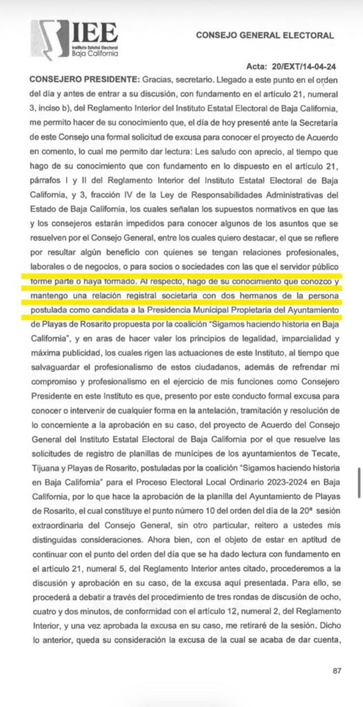 En sesión del pleno, Hernández Morales incluso se excusó de votar en la aprobación de la candidatura de Adame Muñoz, al señalar el 14 de abril de 2021: “al respecto, hago de su conocimiento que conozco y mantengo una relación registral societaria con dos hermanos de la persona postulada como candidata a la Presidencia Municipal Propietaria del Ayuntamiento de Playas de Rosarito propuesta por la coalición “Sigamos haciendo historia en Baja California””.